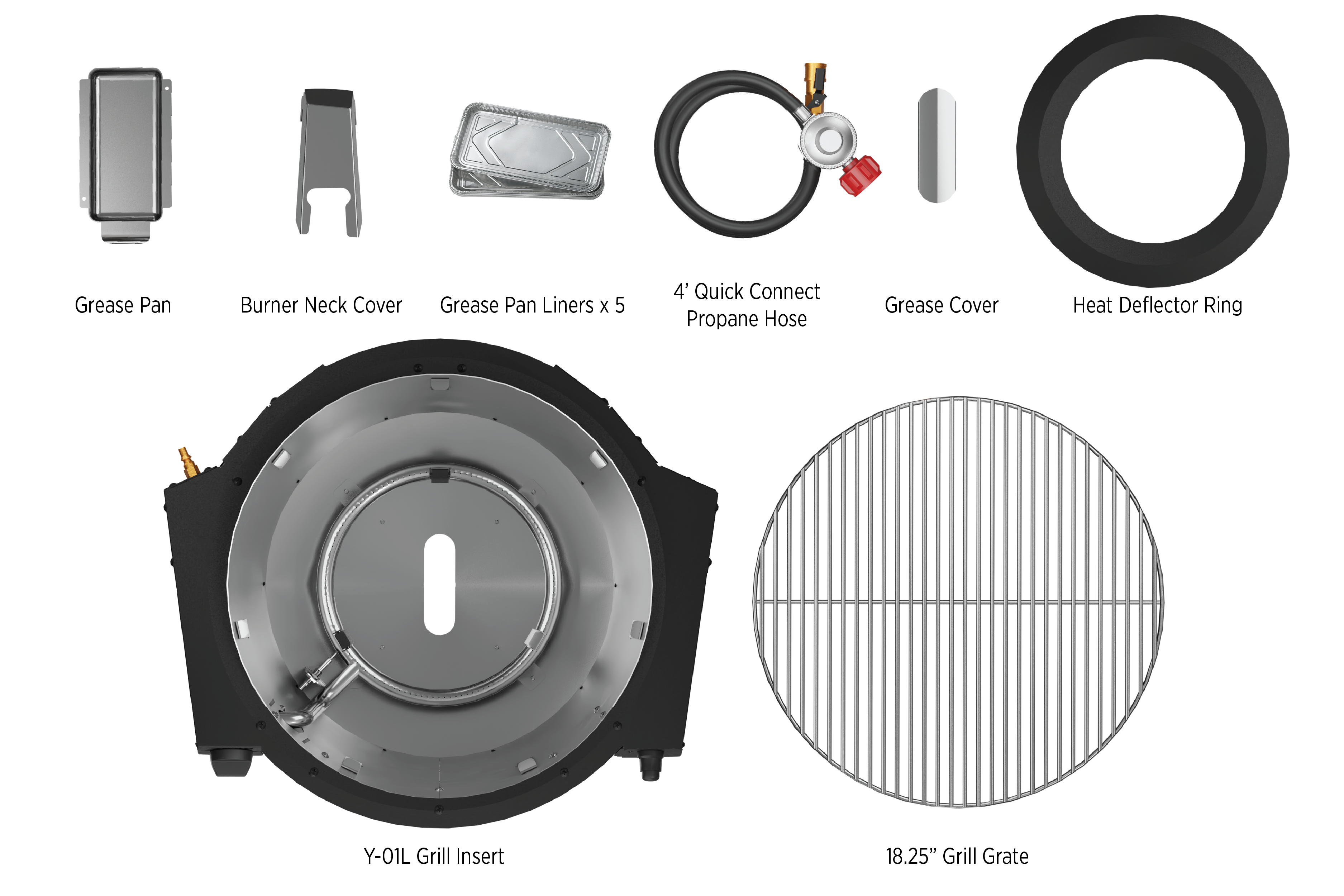 • Includes Grill Grate, Quick Connect Propane Hose, Heat Deflector Ring, Grease Pan, Grease Pan Liners x 5, Burner Neck Cover, & Grease Cover